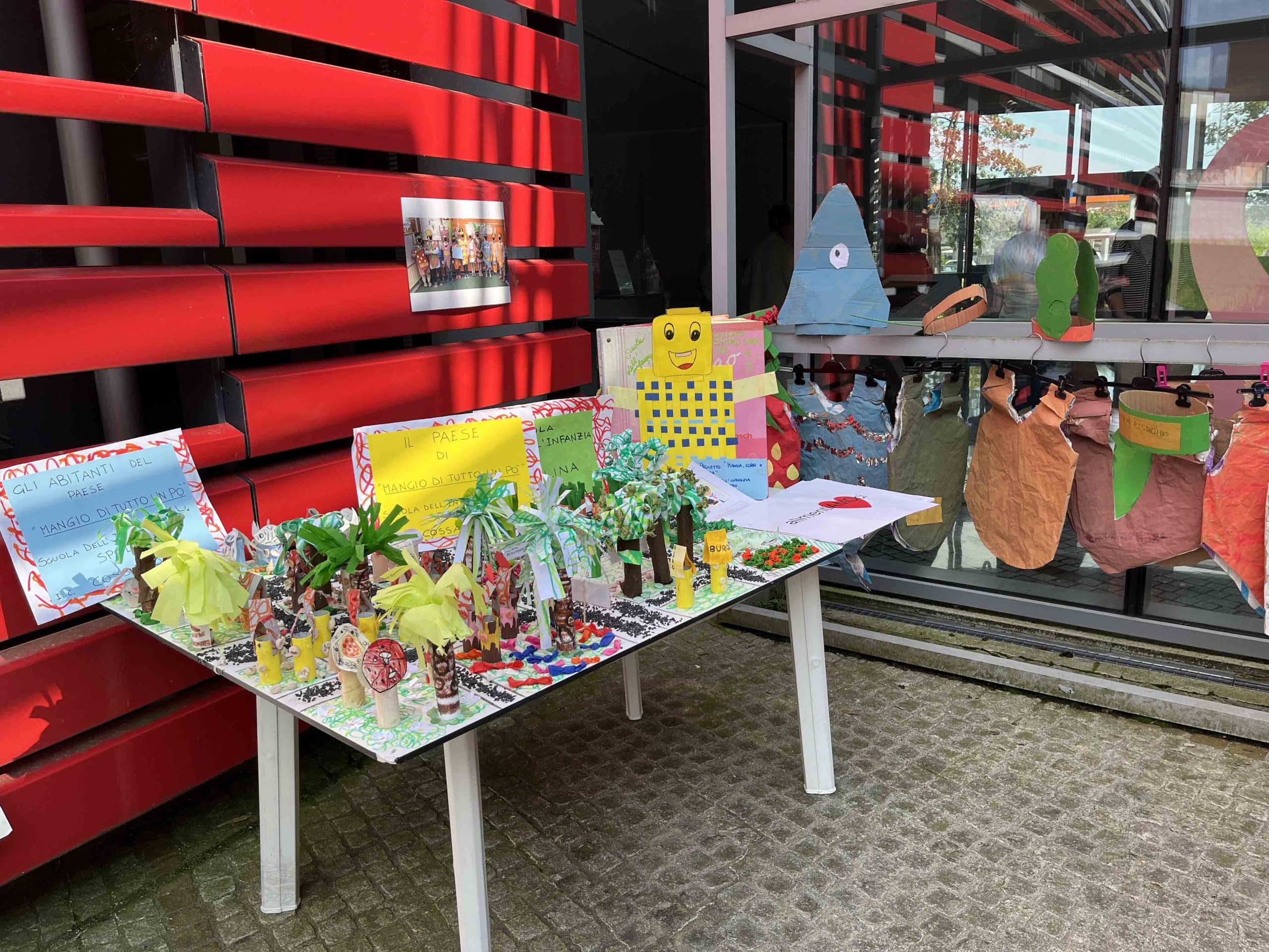 I bambini della Scuola dell’Infanzia di Cossato Spolina e le loro maestre hanno dato vita al paese di “Mangiodituttounpo’” in cui la piramide alimentare è stata trasformata in piccoli quartieri tematici caratterizzati da elementi significativi ed identificativi con materiali totalmente riciclati. Durante la festa di fine anno, inoltre, i bambini sono diventati protagonisti della realtà del villaggio con costumi realizzati a partire da sacchi di farina personalizzati con colori, scritte e altri accessori.